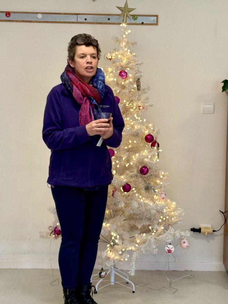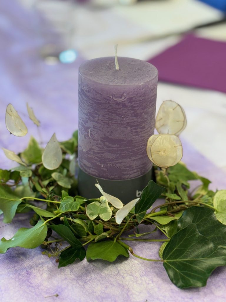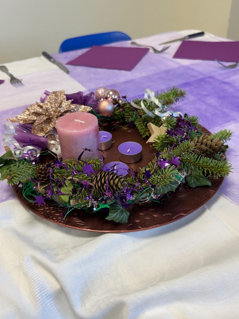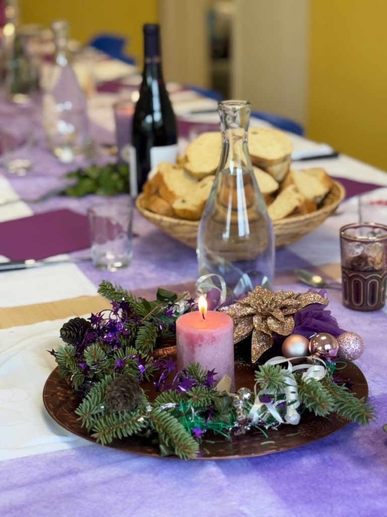 Upon arrival, there was Christmas music playing setting the scene perfectly, and we were welcomed with a choice of drinks. The room was decorated with bunting, a Christmas tree and beautifully decorated tables in a large U shape. On the tables our places were set and interspersed with lovely decorated candles. The “staff” were smartly kitted out in purple aprons, tying in with the purple on the tables, around the room and the colour of the advent event.