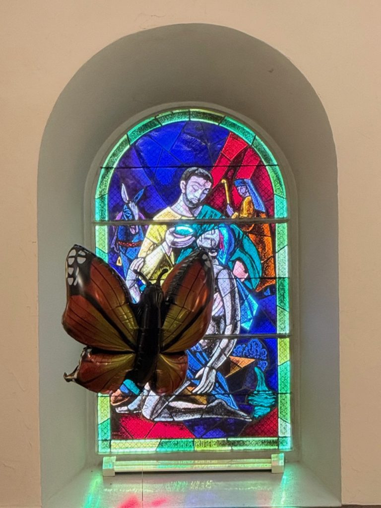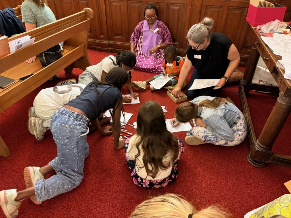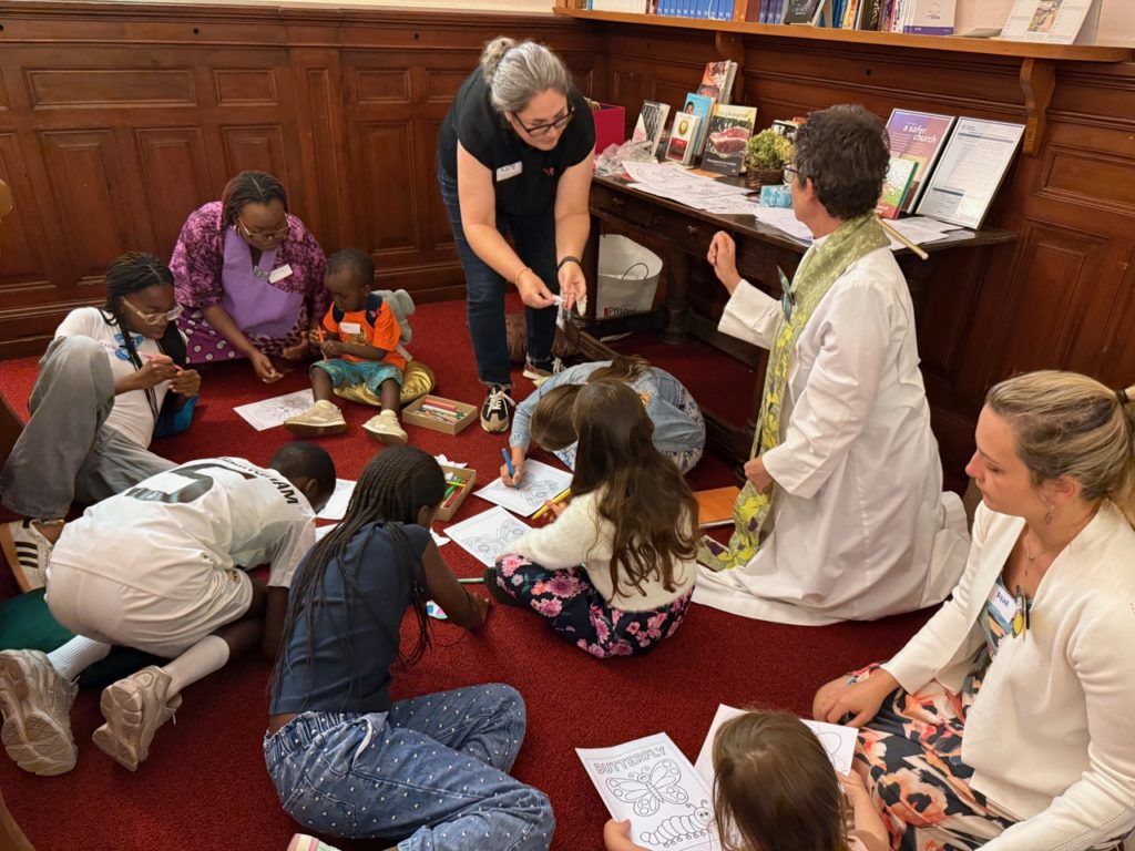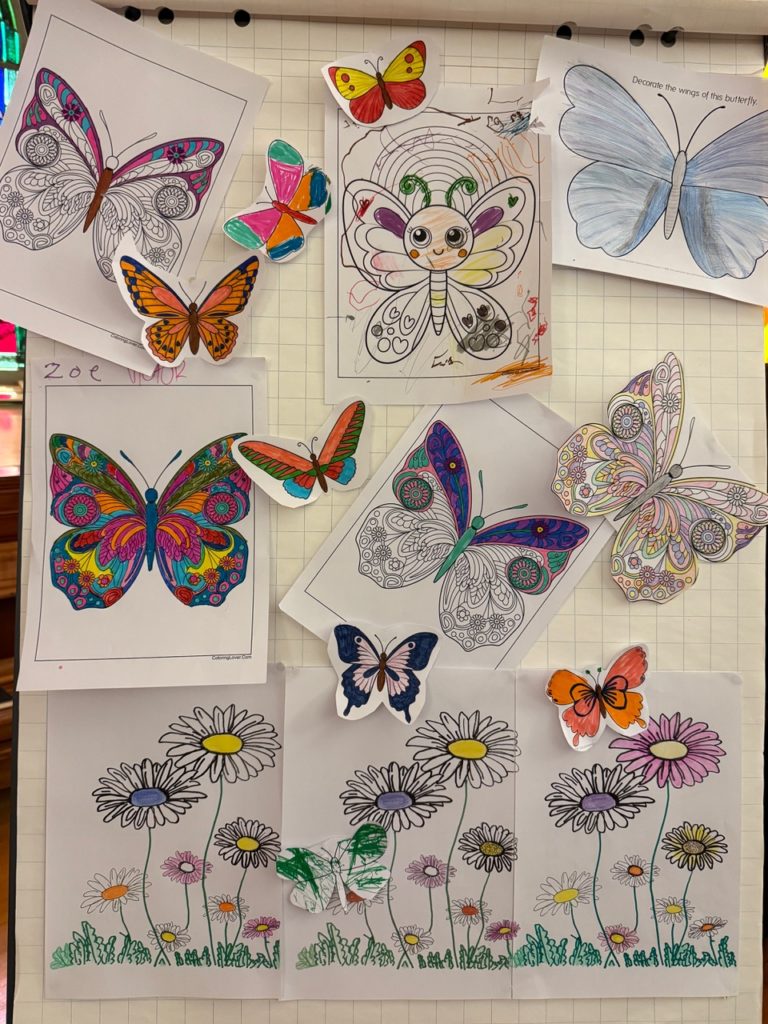 During the second talk, about how we can help protect our beautiful world with reflecting on the damage we are doing and how to avoid it, the children moved to an area provided for them where they could look at and create beautiful colourings of butterflies. Afterwards these were displayed on a notice board at the front of the church.
