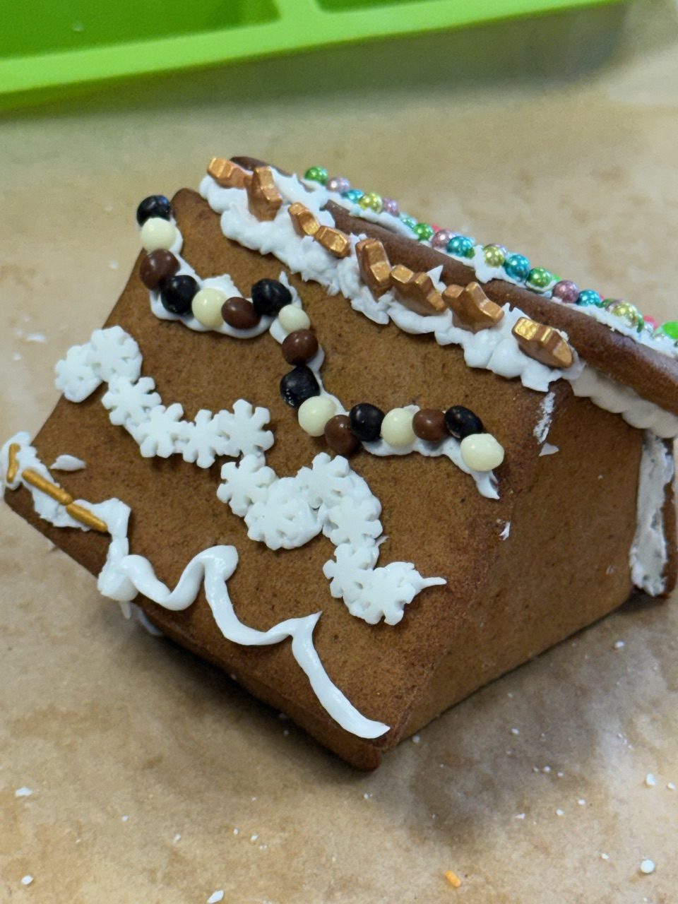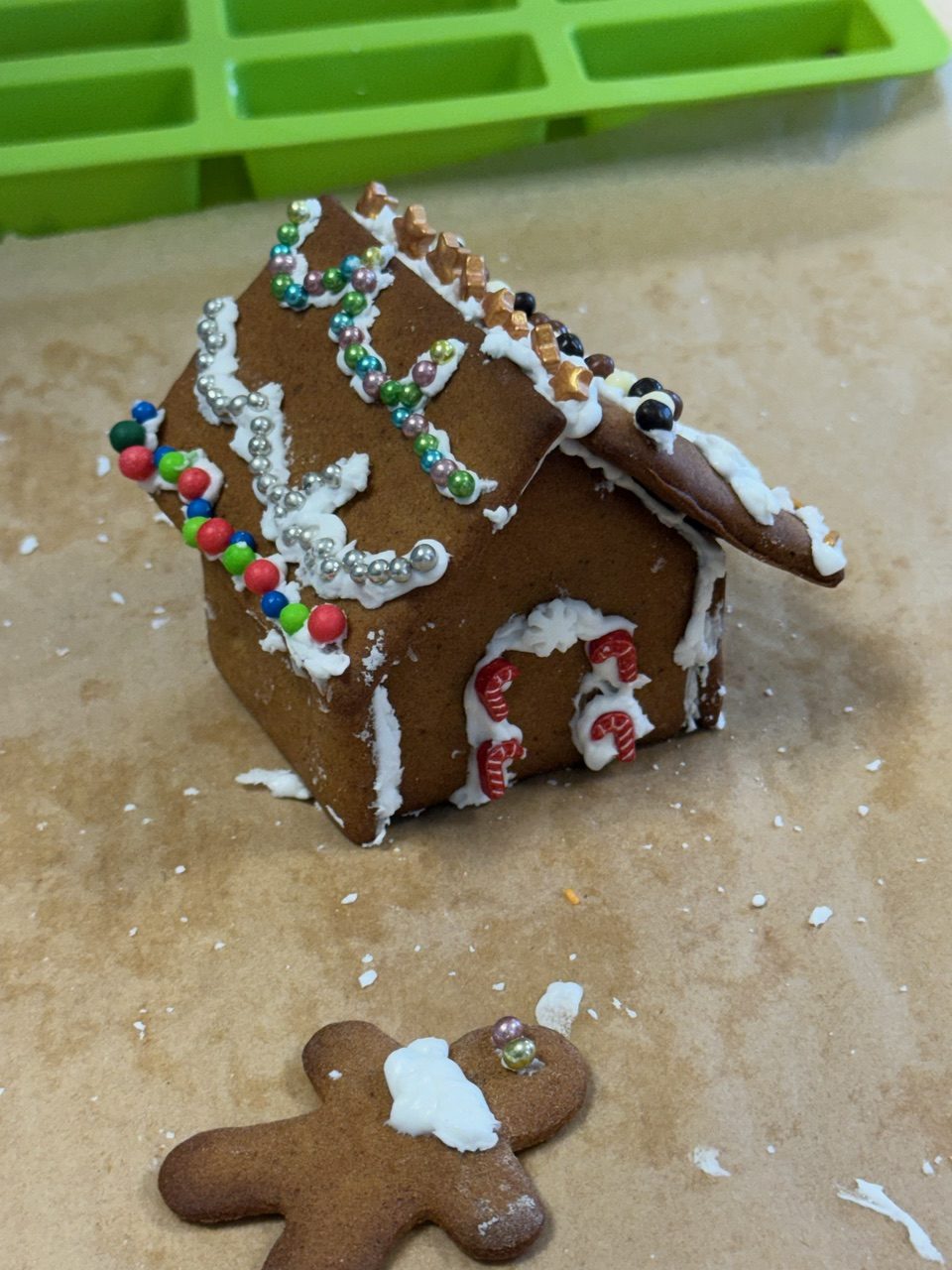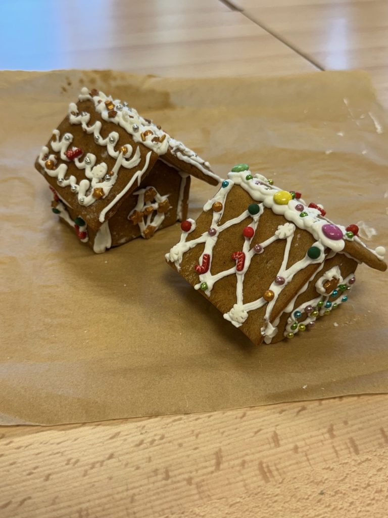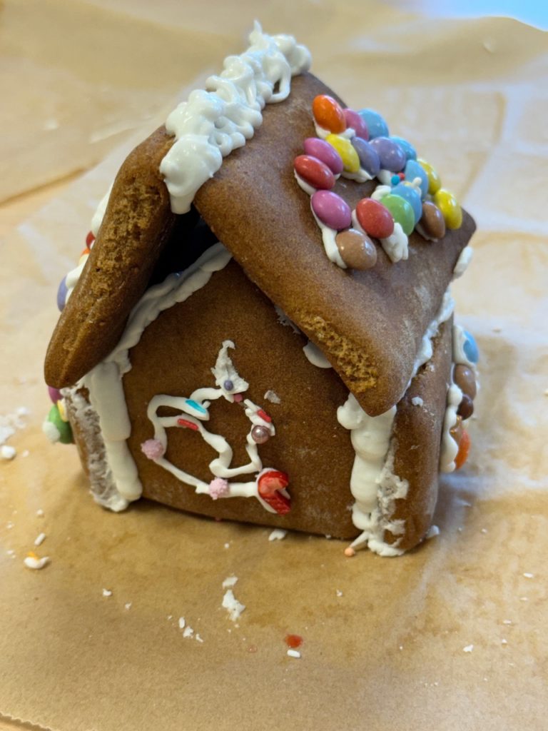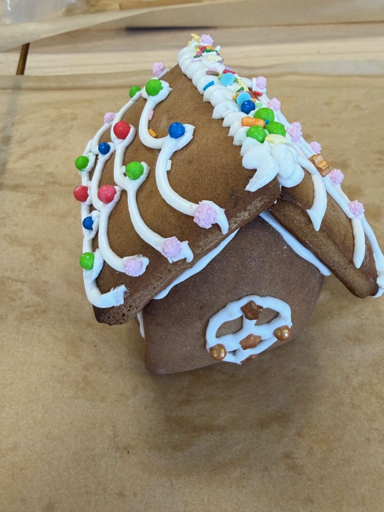 Participants ranged in age from 3 year old children – through siblings – parents and grandparents. There were six children and twice as many adults all working and chatting together. Everyone had a great time decorating and constructing their gingerbread houses.