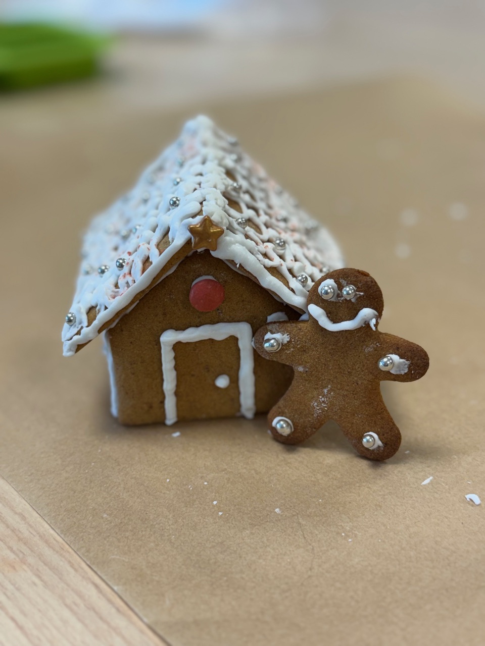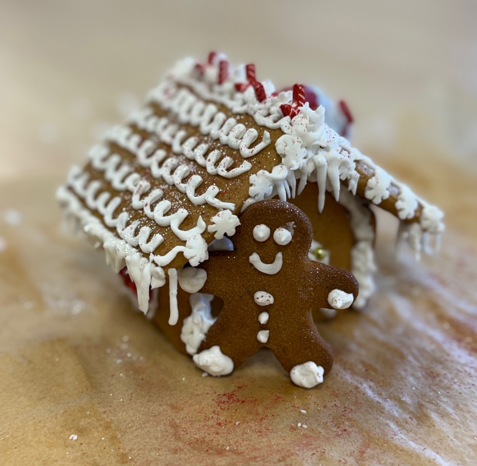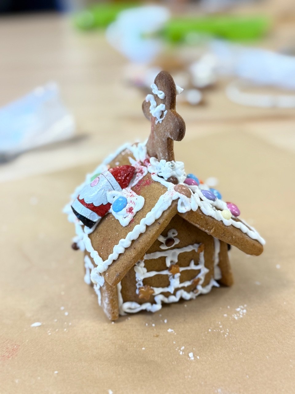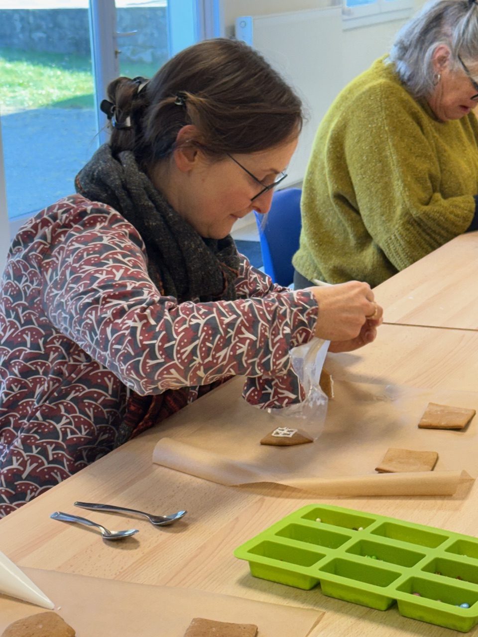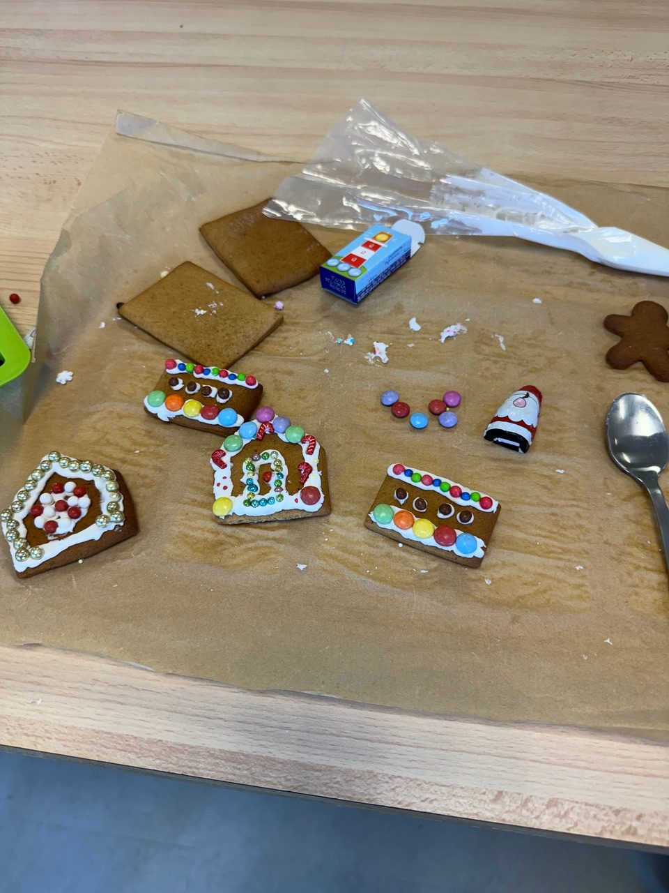 All the gingerbread house pieces were freshly baked by Gigi Talbot along with gingerbread men. As people arrived a set of house pieces, decorations and a bag of icing sugar was provided and Gigi gave an explanation of how to create a beautiful Gingerbread House.